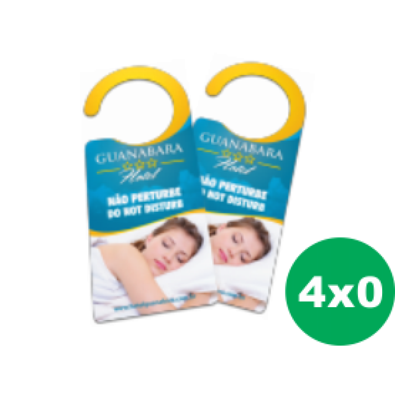 50 Cabides de aviso - 8,5x19,88cm - 4x0 cores - PVC branco 0,3mm - Corte especial padrão e laminação brilho total frente e verso
